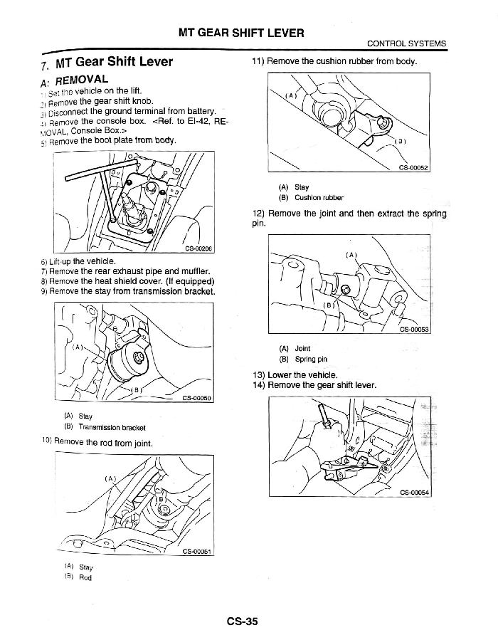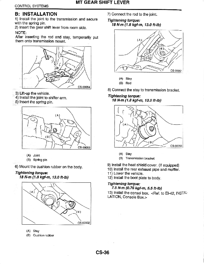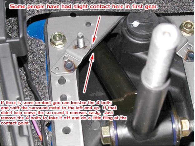 Shifter: The center console for the WRX doesn't have screws holding it in like the RS. Rather, there are some hidden tabs and clips as shown in the pictures. The way to remove the console is to pull up the emergency brake, and open the hatch to its rear compartment. Using a flat blade screwdriver, which should be wrapped with a towel to prevent scratching the plastic, pry up the back half at the slots shown in the picture. After it's up enough to grab the back half, just tugged firmly to remove it. Unplug the mirror controls so you can put it aside. Note where the clips are and put them back on the upper part before installing it. For the front half, unscrewed the shift knob all the way. It's attached to the boot so just let it rest there when it's unscrewed. Next remove the front half of the console top. Grab the back part that's exposed and tug up. It sort of hinges at the front under the radio section. Now the shifter will be exposed. You'll need the car up on ramps or jack stands. Make certain the car is SAFELY in the air, you are going to get all the way under the car at the center. The WRX seems to have enough room to get your arm in and grab the rods after unbolting and remove them. Bolt in the Xcceleration short shift, tighten all bolts, replace boot and console. Enjoy short shifting.  |